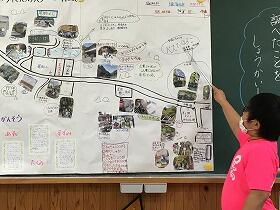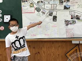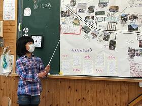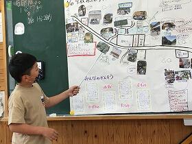 先月3年生が尾前地区を探検したことを写真や自分の感想を交えて地図にまとめました。今日はその発表会で、子どもたち1人1人が自分の担当施設を説明しました。保育所の年齢別の子どもの数の報告やお店でのレジ打ち体験など、見たこと、聞いたこと、体験したことを詳しく説明できました。自分たちの住んでいる尾向地区の再発見ができたようです。