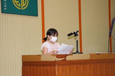 はじめに、3年生の代表児童が作文を発表しました。がんばったこととして、「協力し合ったこと」「本をたくさん読んだこと」「歩いて帰ったこと」を挙げ、2学期もがんばりたいという決意を堂々と発表することができました。