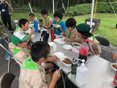 その他、食事作りやキャンプファイヤー、グリーンチャレンジを体験することができ、充実した2日間となりました。他の団体(東大宮小みどりの少年団)との交流もでき、よい思い出ができたようです。1日目の夕食はカレー、2日目の朝食はみそ汁でした。主催者によると、コロナウイルス感染症や台風の影響で、キャンプができたのは5年ぶり、キャンプファイヤーは8年ぶりだったそうです。今年は2日間とも素晴らしい天候に恵まれました。