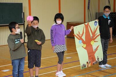 そのあと、これから全校で取り組む「読書の木」の紹介がありました。読んだ本の名前をリンゴの形をした紙に書き、大きな木に貼っていくものです。子どもたちの読書意欲が高まることを願っています。