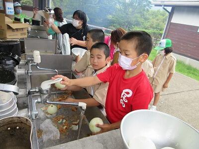 夕方からは夕食作りをしました。お母さん方に手伝っていただきながらカレーライスを作りました。ご飯は飯ごうを使って炊きました。みんなで食べるカレーは最高においしかったです。