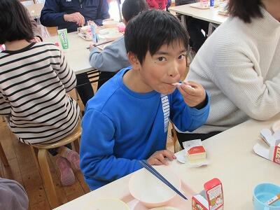給食には、クリスマスメニューでケーキがつきました。子どもたちは、事前に選んだイチゴかチョコのどちらかをおいしくいただいていました。