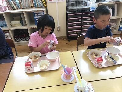 1年生にとっては、初めてのおにぎりの日で、好きな形におにぎりにして、美味しそうに食べていました。