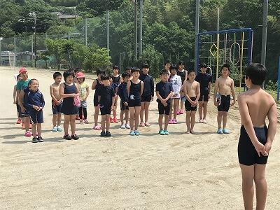 入水前には、今年も安全で、楽しい水泳指導になることを全児童、職員祈りました。