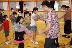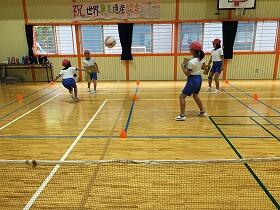 3~6年生は体育科で「ネット型ゲーム」の学習をしています。段ボールで作ったラケットのようなものを手にはめ、ワンバウンドでパスをしたり相手と対戦したりする内容です。ラケットの面を上手に操作し、ラリーが続くようになっていました。本年度から始まった新しい内容の授業です。