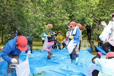 子どもたちは慣れた手つきで枝をゆらしたり、枝からもぎとったりしました。5・6年生が木に登って枝を大きく揺らす姿も見られました。