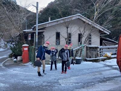 1枚目の写真は月曜日の登校風景です。子どもたちは寒さに負けずに元気です。2枚目の写真は体育館横の倉庫にできた「つらら」です。長いものは1mくらいあります。さすが椎葉の冬です。