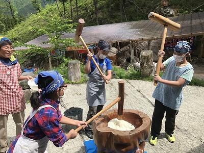 素晴らしい天気の中、草川小の5年生とも2日目ということもあり、互いに打ち解けた雰囲気の中、向山の「つぶつぶまんま」に行きました。三つの班に分かれて、午前中は、手打ちそば作り、餅つき、山菜収穫を体験しました。昼食は、自分たちで作った、手打ちそば、あんこ餅、よもぎ餅を食べた後、午後からは、自分たちで収穫した山菜をトッピングした山菜ビザ作りをしました。山菜ピザは、普段食べるようなピザの味付けではなく、自分たちで採ってきた山菜を選別していただいて、ピザ生地を窯で焼いたあと、オリーブオイルを生地に塗り、山菜を生地の上にのせ、再度窯で焼いて、塩をパッパと振りかけて食べました。
