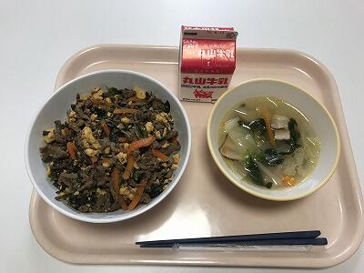 今日の給食は、ビビンバ、野菜スープ、牛乳でした。