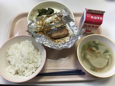 今日の給食は、麦ご飯、さばのホイル焼き、ゆかりあえ、のっぺい汁、牛乳でした。