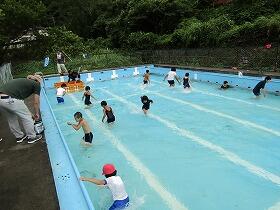 プールでの釣り教室では、餌の付け方等を習った後、一斉に釣り竿を出し、大きな魚を釣り上げ大喜びの子ども達でした。終わりには残った魚のつかみ取りも行われ、大歓声を上げていました。