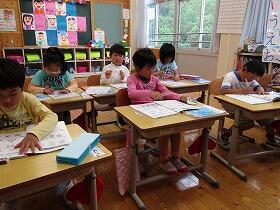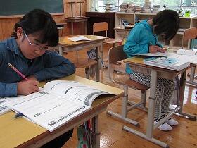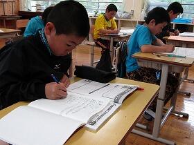 2時間目の授業を覗いていみると、1年生と5年生が算数の授業の中で、今年算数の活用力を伸ばすためにPTA予算で購入させてもらった問題集に取り組んでいました。導入→習得→活用→探求と4段階で学べる問題集ですが、子ども達は問題が解けて丸がもらえるととてもうれしそうでした。