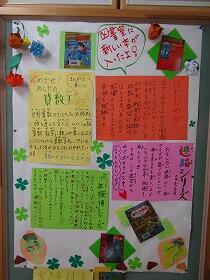 最後の写真は、昨日学習ボランティアのお母さん方が作ってくださった、新刊本紹介の掲示物です。職員室前の廊下に掲示してあります。廊下にとても素敵なコーナーができました。ありがとうございました。