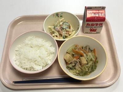 今日の給食は、麦ご飯、豚肉と油揚げのみそ炒め、マカロニサラダ、牛乳でした。