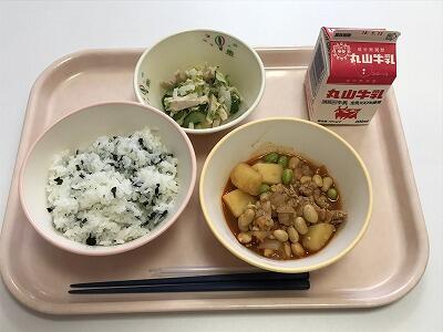 今日の給食は、わかめご飯、ポークビーンズ、ハムサラダ、牛乳でした。