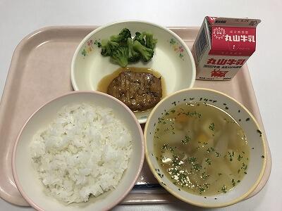 今日の給食は、麦ご飯、根菜ハンバーグ、添えブロッコリー、ビーンズスープ、牛乳でした。