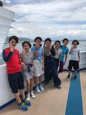 天気が心配されましたが、今日は雨も上がり、尾向小6年生7名も全員元気に集合しました。朝7時から椎葉小運動場にて出発式を行い、バスに乗り込んで、熊本港に向かいました。