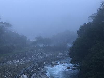 今朝の尾向は、朝霧に包まれて、空気もピーンと糸を張った静けさと、幻想的な世界でした。今朝の気温が11℃と、吐く息も白くなり、山々も少しずつ紅葉が始まっています。
