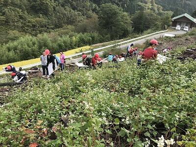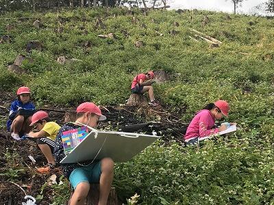 今日は、8月6日に焼畑体験学習で撒いたそばの種から、どこまで花や実がついたか観察に全校児童で行きました。当初の計画では、5日(金)でしたが、雨天のため本日になりました。