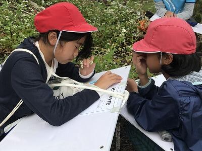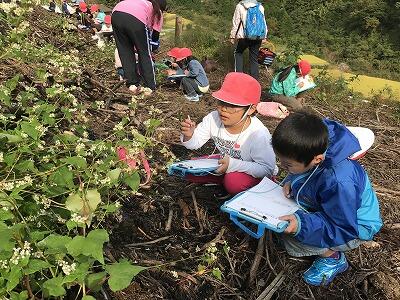 子どもたちは、担当の先生からの話を聞いた後、そばの花の観察をしました。実際に手に持ったり、匂いをかいだりしながらワークシートに、気付いたことや花の絵を描き込んでいました。そばの収穫は10月23日(火)に、収穫祭は11月19日(月)に計画しています。