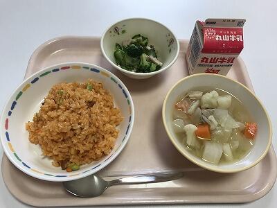 今日の給食は、チキンライス、ポトフ、グリーンサラダ、牛乳でした。