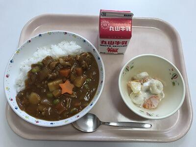 【今日の給食は、チキンカレー、フルーツヨーグルト、牛乳でした。】↓