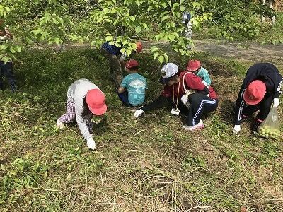 今日は、旧尾向小学校跡地に梅ちぎりに全校児童、先生方で出かけました。