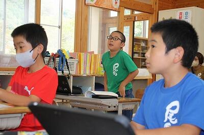 本校は、不土野小学校とリモート学習を行っています。これまで、5・6年生の社会と3年生以上の道徳で行ってきました。2学期からは、1・2年生も道徳のリモート学習を始めました。