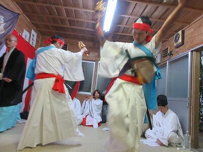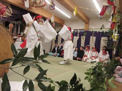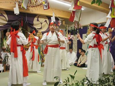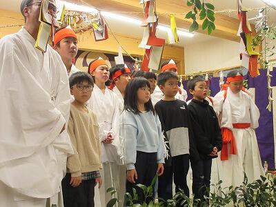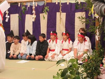 子ども神楽は小学生2組が舞いました。1・2年生はお囃子を行いました。また、学校職員も舞手としてがんばりました。たくさんの声援を受けて、堂々とした舞を披露していました。