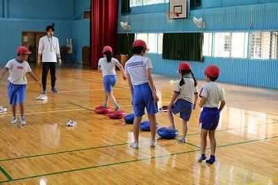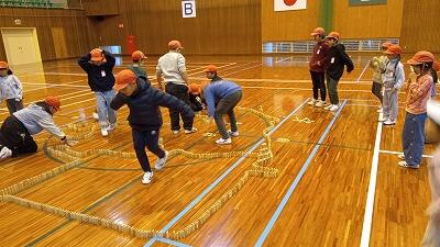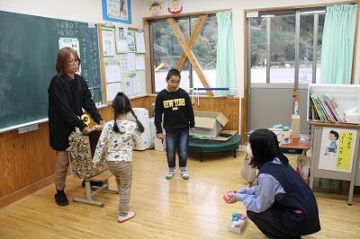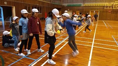 玉入れ、スプーンリレー、宝探しといった団体競技や、不土野小の子どもたちが得意とするドミノなど、様々なゲームを一緒に楽しみ、体育館は大盛り上がりとなりました。