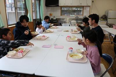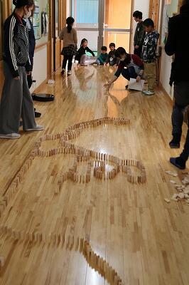 みんなで給食を食べた後は、子どもたちが最近夢中になっているドミノ遊び。新しい友達もすぐに輪に入り、楽しい時間を共有しました。