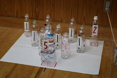 【ボウリング】ペットボトルなどで作られた手作りボウリング。