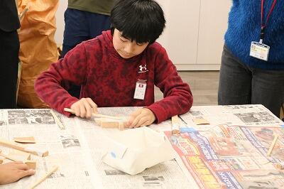 メインの活動は、自分だけのオリジナル箸の製作に挑戦。共同作業を通して、すぐに打ち解けることができました。名前の焼き印がオリジナル感があっていいですね。私も欲しいです。