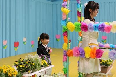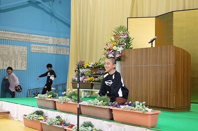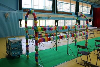 12日(土)の入学式に向けて、体育館内の装飾が少しずつ整ってきました。カラフルな花いっぱいに彩られたアーチくぐって、新入生が入場してきます。