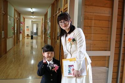 入場直前の様子です。担任の先生と体育館の出入口でピース。少しまだ緊張しています。