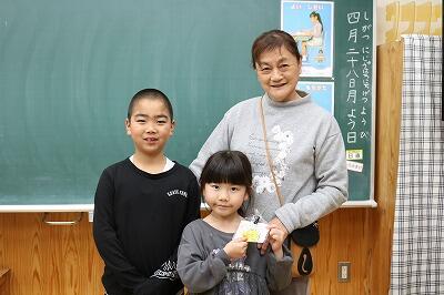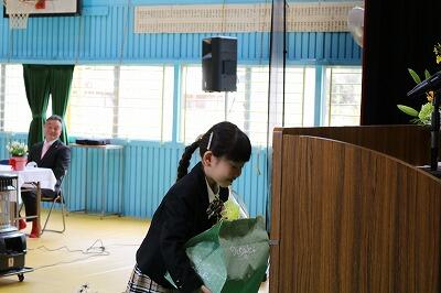 椎葉村から入学記念品をいただきました。大事そうに抱えながら礼をする姿にみんな感心しきりです。素晴らしい動きでした。