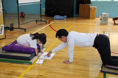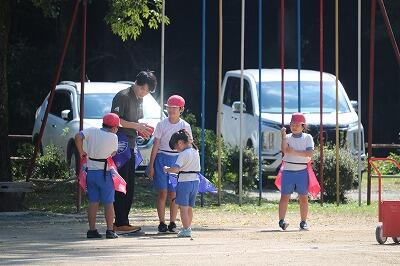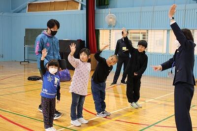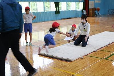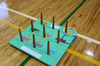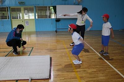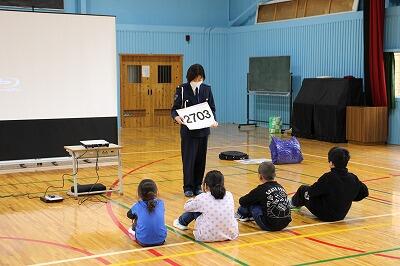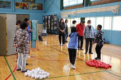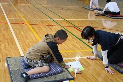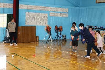 玉入れ、スプーンリレー、宝探しといった団体競技や、不土野小の子どもたちが得意とするドミノなど、様々なゲームを一緒に楽しみ、体育館は大盛り上がりとなりました。