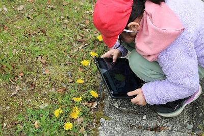 3年生が運動場のタンポポをタブレットPCのカメラで写真を撮っています。理科の学習中のようです。