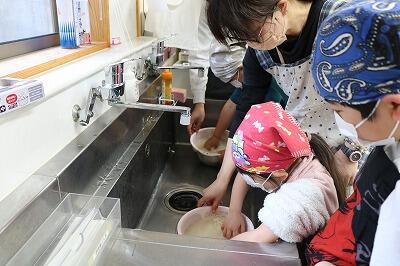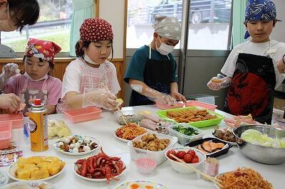 さて、いよいよ料理教室です。保護者の方がいくつもおかずを作ってきてくださっています。子どもたちは、一升のお米を全部おにぎりに、そして、おかず作りのお手伝いです。