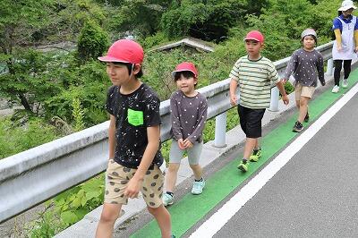 横断歩道の実地指導です。椎葉村内には上椎葉に1箇所あるだけの横断歩道ですが、実際に横断歩道に出くわしたときにドキドキしなくて済むようにしっかりと練習します。
