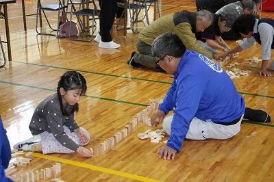 この日、全員参加で大きく盛り上がったのがドミノ大会です。全部で1000ピースのドミノを、参加者全員で並べました。