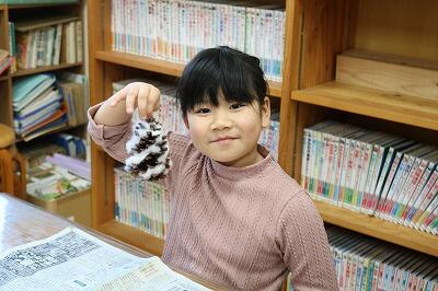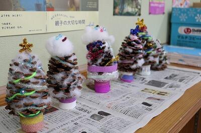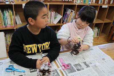 一つひとつ形が違う松ぼっくりが、子どもたちの手によって個性豊かなミニツリーへと生まれ変わりました。