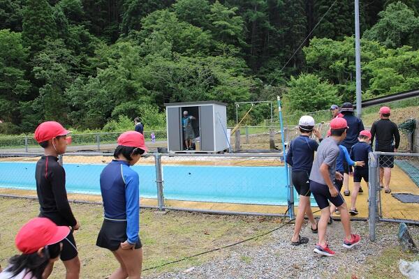 後半は、着衣泳です。1年生から6年生まで、みんな長袖シャツや長ズボン、靴を履いて準備します。