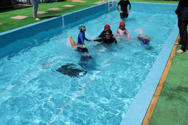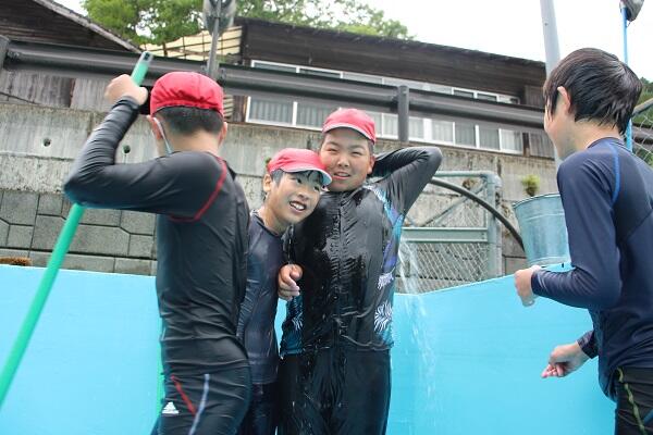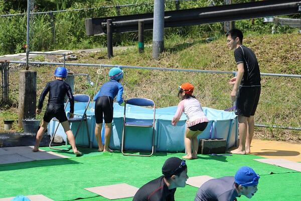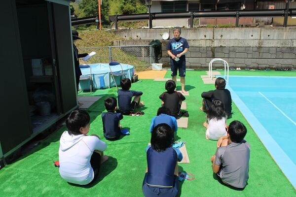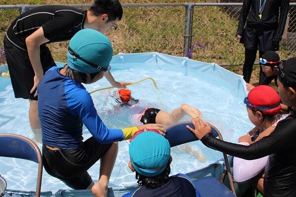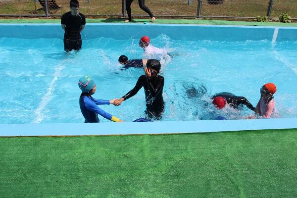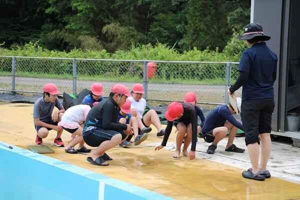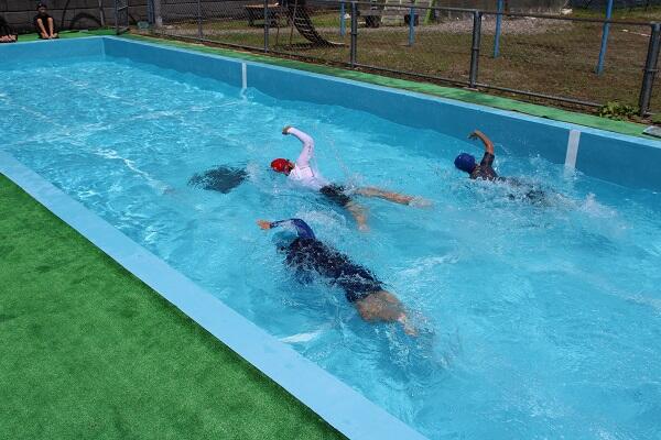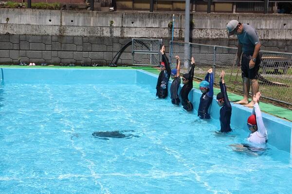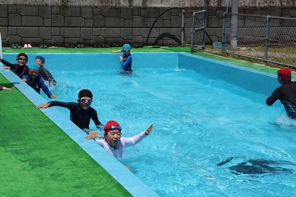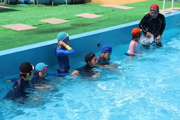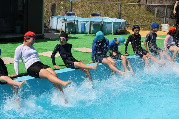1~3年生が水遊びをしながら水泳の基礎を身に付けています。