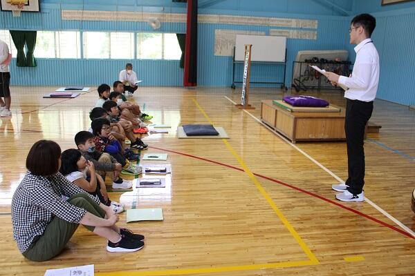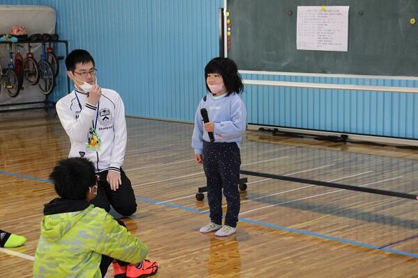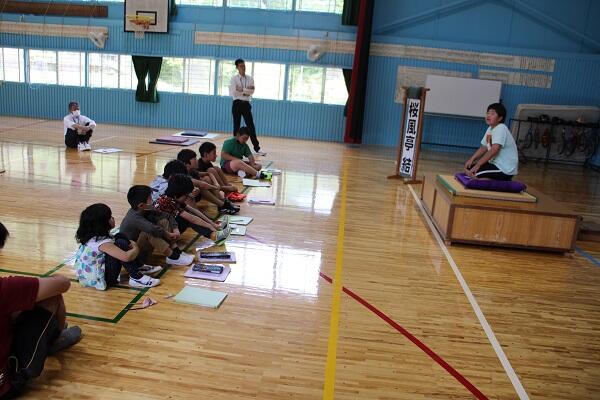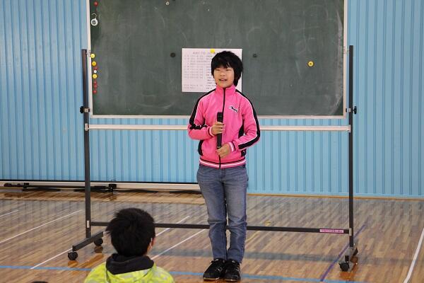 落語担当の先生から出場する2名の子どもが紹介され、みんなで気持ちを込めて拍手をしました。