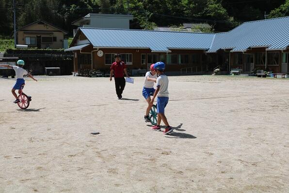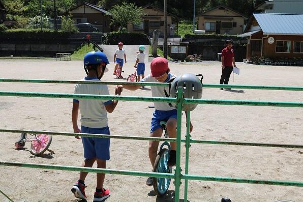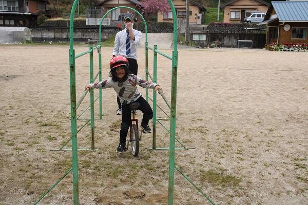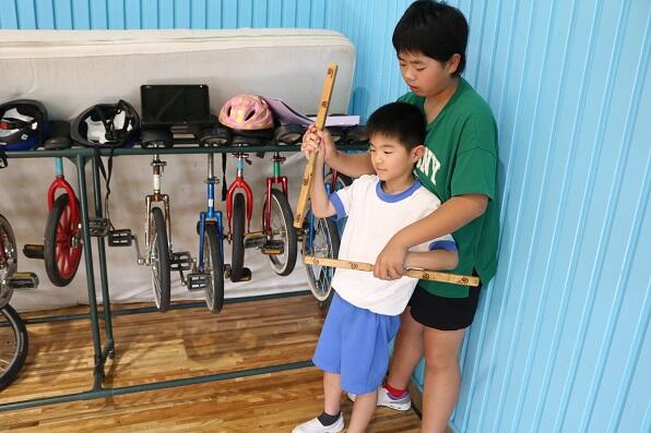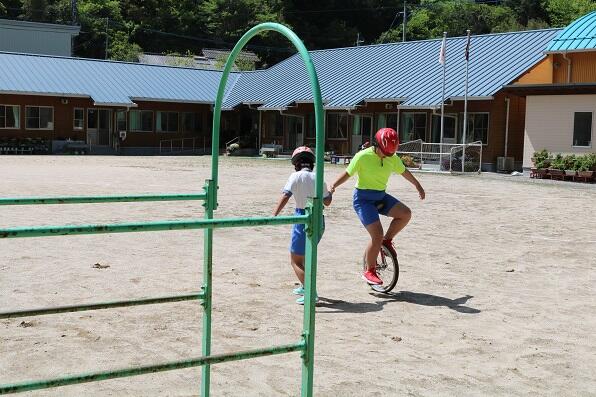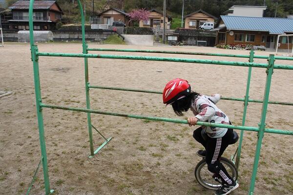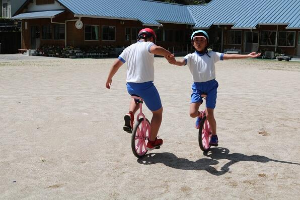 1年生が今日も一輪車の練習です。びっくりするほど上手に乗れますよ。