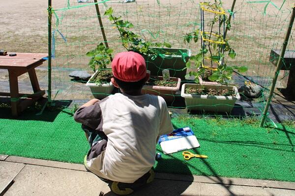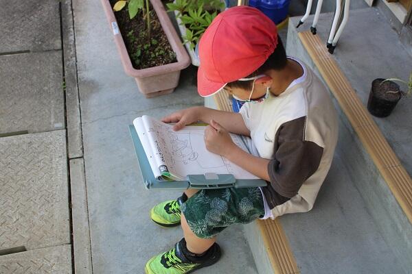 プールにいるオタマジャクシを描いていたようです。春の生き物探しでしょうか。