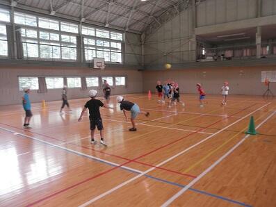 ボールは投げたらだめで、手に持ったボールを反対の手で打ち出してパスをする、蹴る、手に持って走る、バウンドさせてまたキャッチするなどをしてボールをゴール近くまで運ぶようです。(説明が合っているかは自信ないです。)最後は、4本立ててあるポールの間を狙って蹴ってゴールです。
