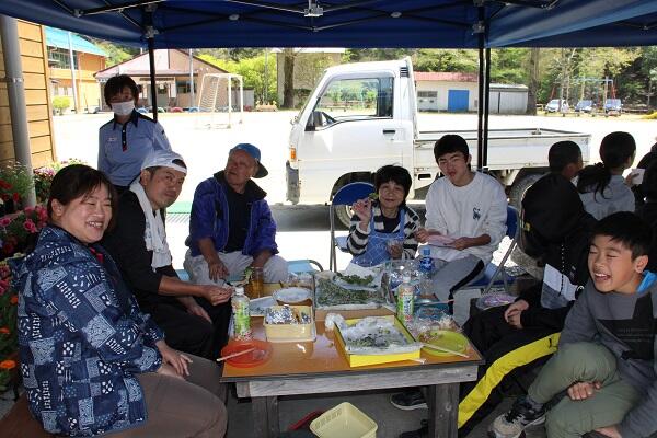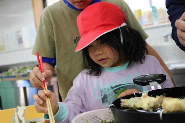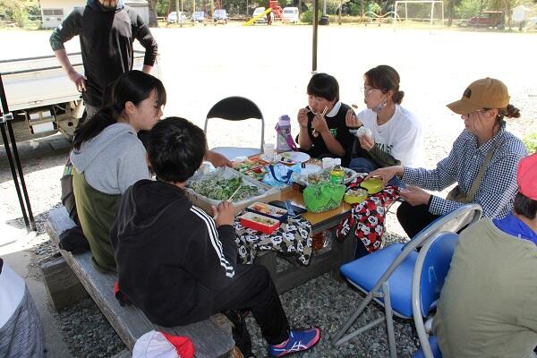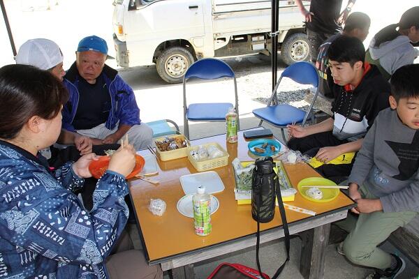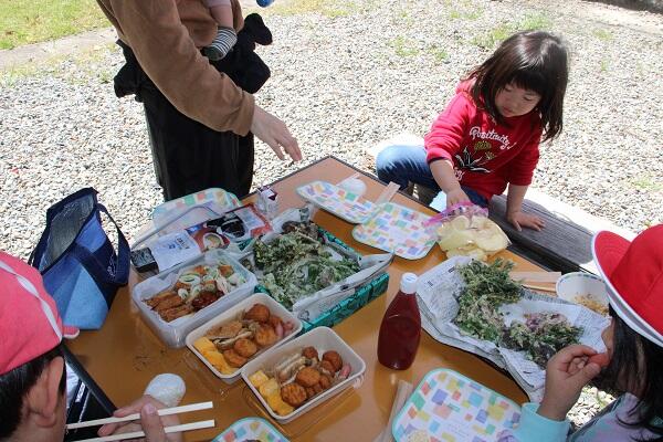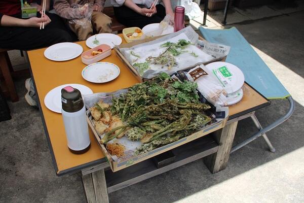 持ってきたお弁当と山菜の天ぷらを家族ごとに食べました。