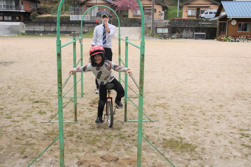 入学して間もないのですが、1年生が一輪車に挑戦したようです。
